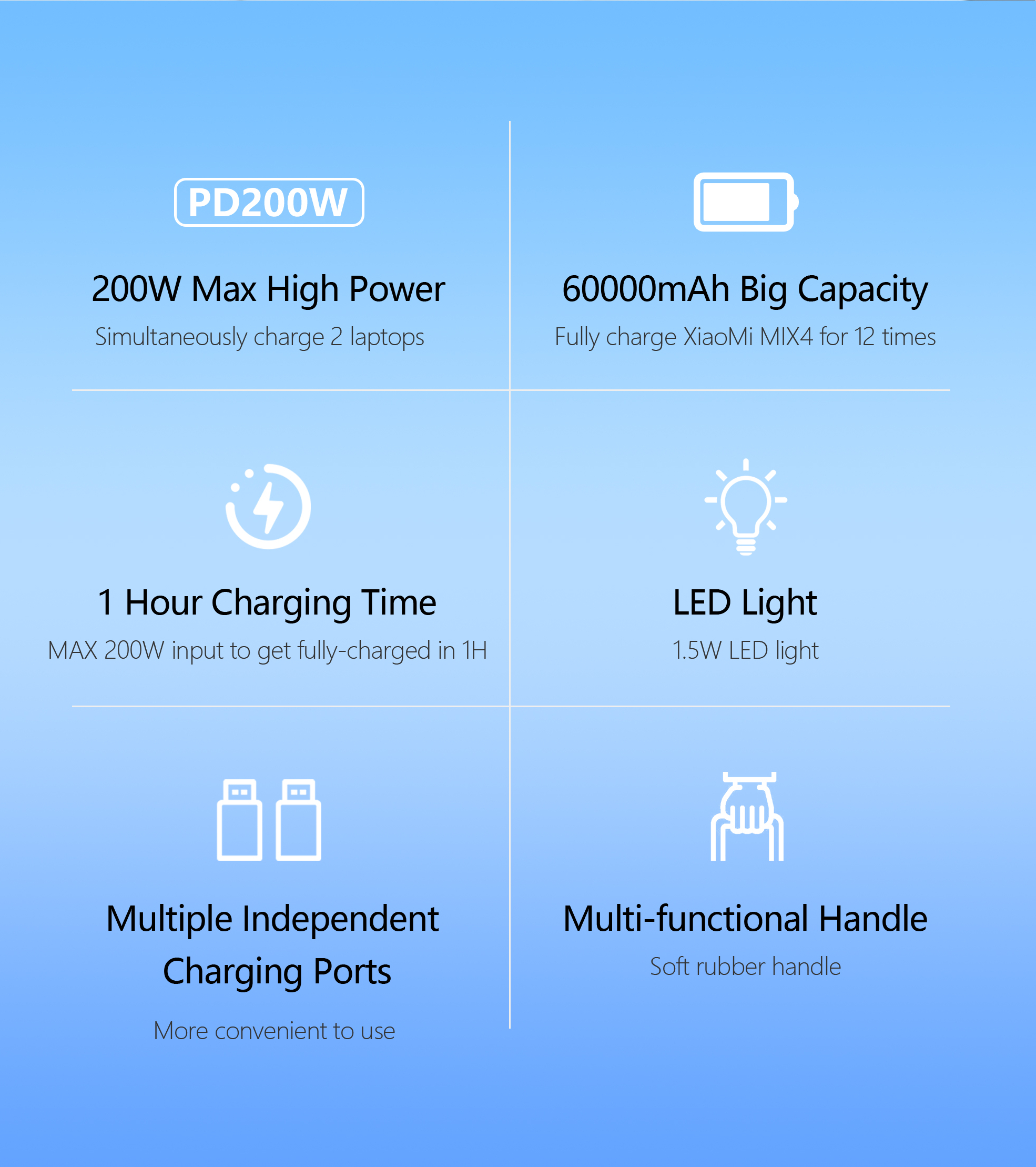 • HIGH CAPACITY | The battery has a large capacity of 60.000 mAh, it can charge a latest generation smartphone about 12/14 times or power a latest generation laptop up to 4 hours. It can not only charge computers, tablets and mobile phones, but also can be used with multiple USB devices such as: cameras, security cameras, projectors, LED lights, earphones, etc.