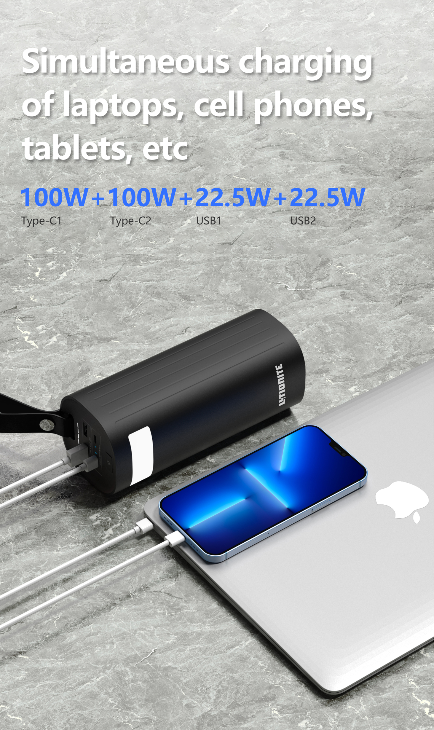 • VERSATILE | It is equipped with 2x 100W USB-C PD 3.0 port (IN/OUT). It can reach 200W while charging 2 devices at the same time up to 100W each one. It also has 2x USB-A (OUTPUT) ports with 18W Quick Charge 3.0 technology. It is possible to charge 4 devices at the same time, but in this case the charging power decreases to 30W Max.
